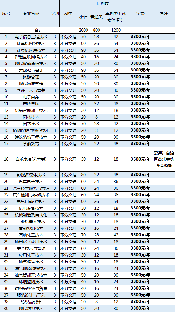 学院严格执行自治区教育厅下达的2023年高职单招计划。2023年学院单独招生专业39个,计划2000名,面向全疆招生。学习形式为全日制。单独招生计划纳入学院今年国家核定的招生计划总数内。