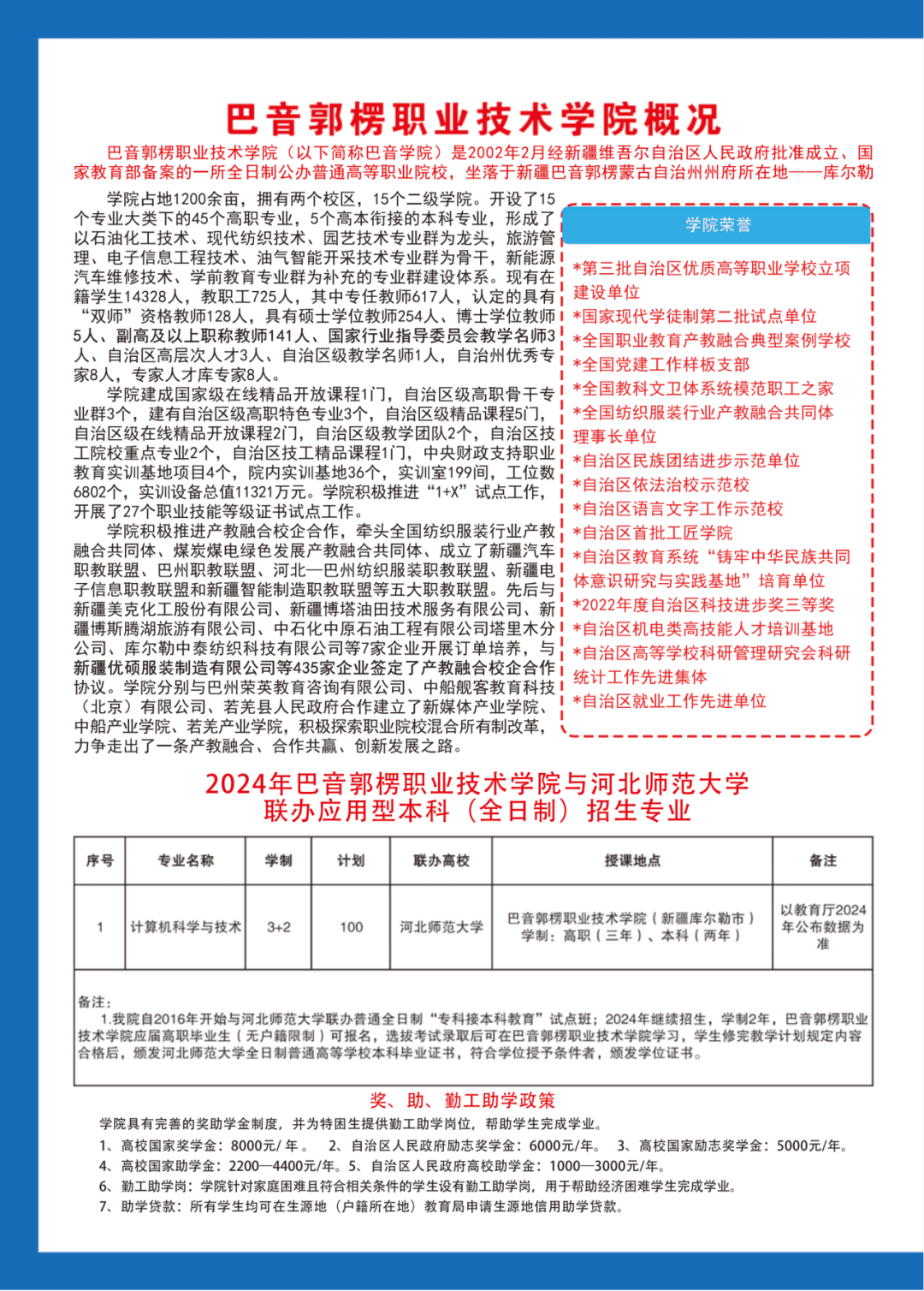 2.我院自2016年开始与河北师范大学联办全日制普通本科(专科接本科教育)试点班、“计算机科学与技术”专业、学制2年;2024年符合报考条件的我院应届高职毕业生、经河北师范大学选拔考试录取后在巴音学院学习、学习期满经考试合格者,颁发国家教育部电子注册的河北师范大学普通高等教育全日制本科毕业证书及学位证书。